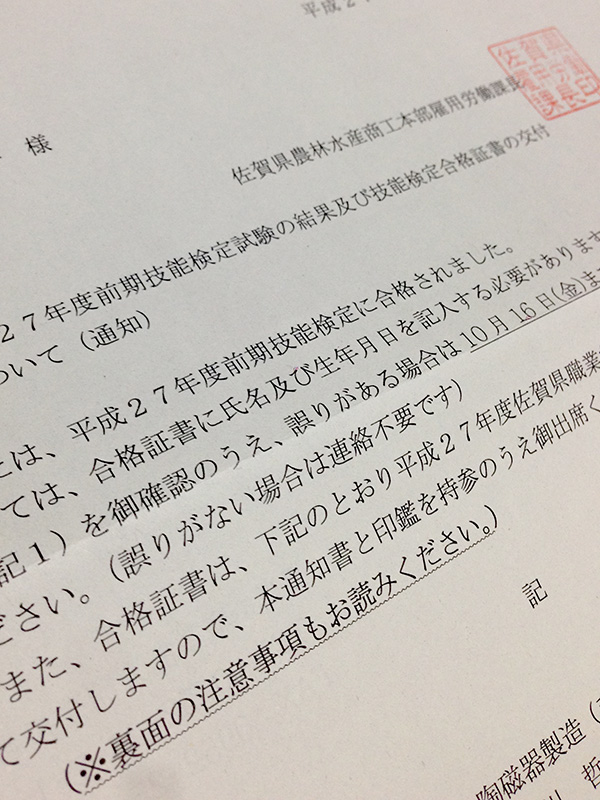 先日受験したロクロの技能士試験、結果が出まして、合格してました。よかった!
