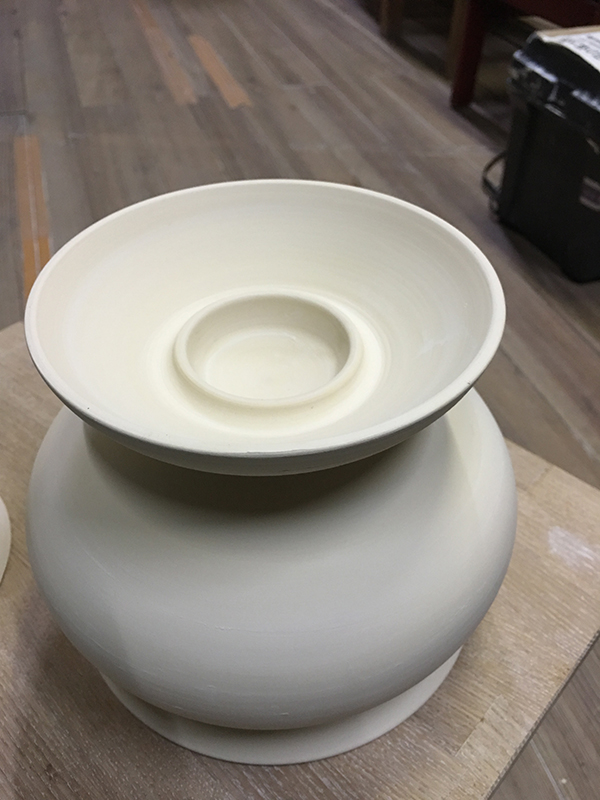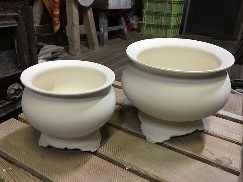 焼くときはこの内側の高台の下に特殊な形状のハマ(焼くときの台)を置いて焼きます。もちろん、三つ足が地につかないような高さにしなければいけないのは言うまでもありません。